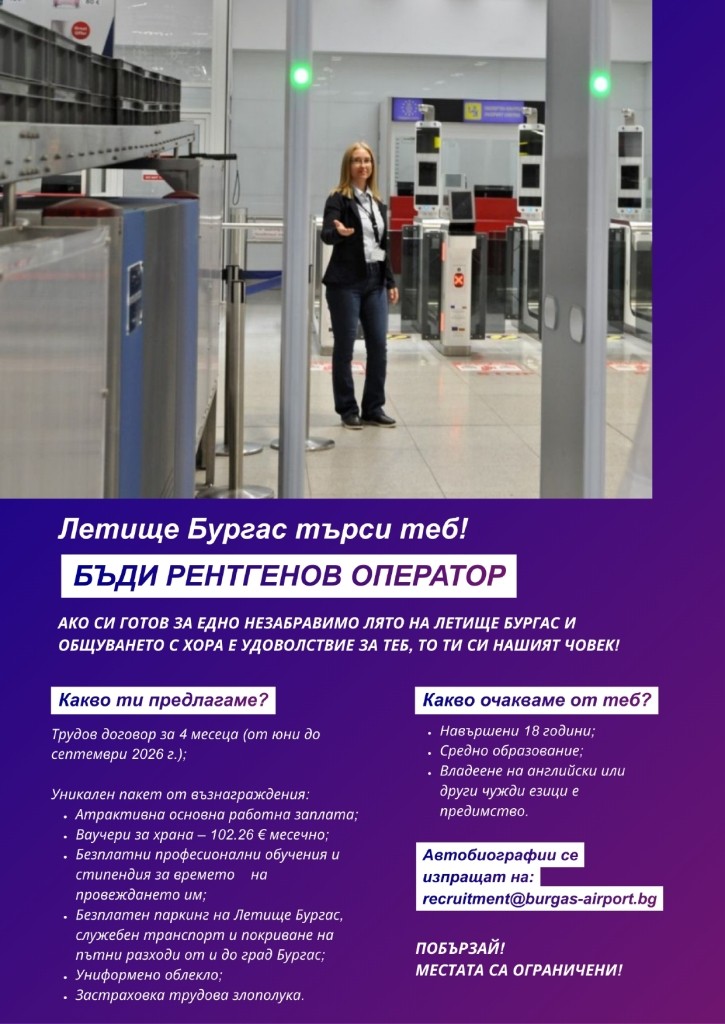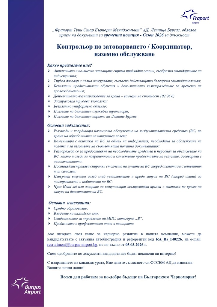 „Фрапорт Туин Стар Еърпорт Мениджмънт” АД, Летище Бургас, обявява прием на документи за временна позиция - Сезон 2026
