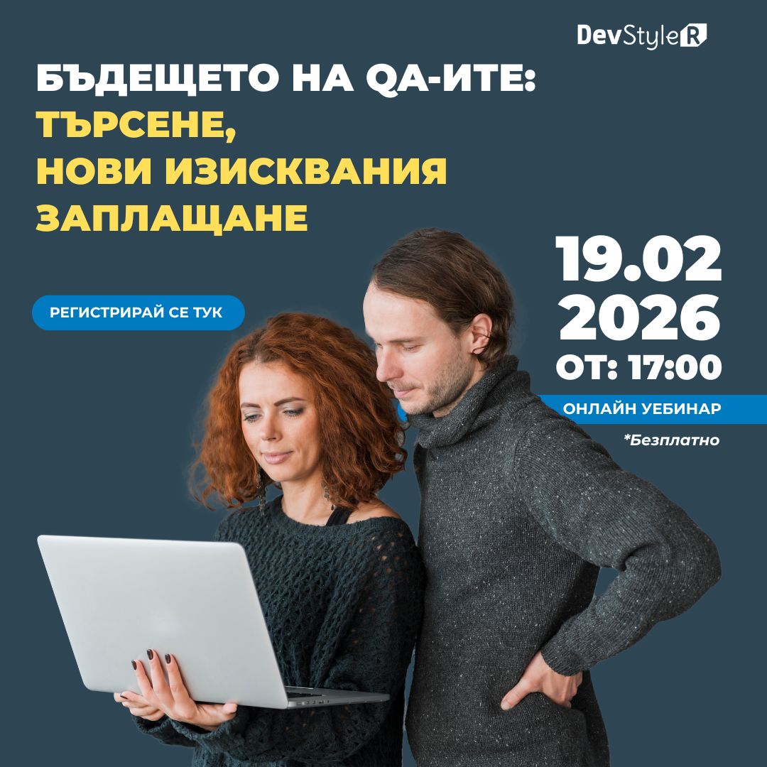 На 19-ти февруари от 17.00 ч. ще се проведе онлайн уебинар на тема „Бъдещето на QA-ите: търсене, нови изисквания и заплащане“. По време на него ще се дискутират темите за бъдещето на QA позициите и влиянието на новите тенденции върху изискванията към кандидатите, структурата на екипите и нивата на възнаграждение. Участието е напълно безплатно, изисква се само предварителна регистрация през линка тук.