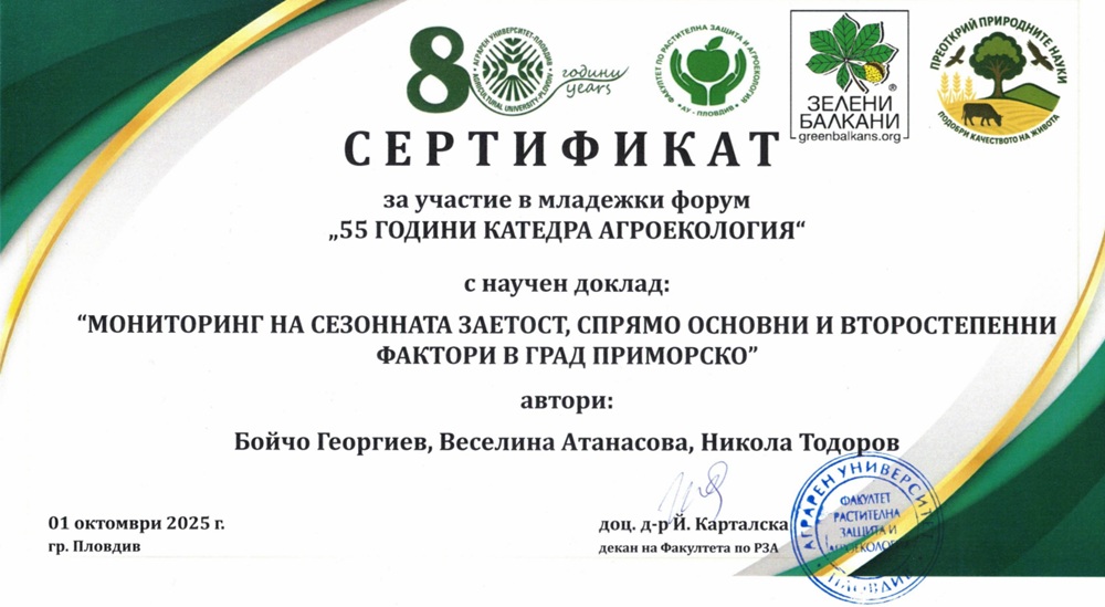 Третият научен доклад също в категорията „Постер“ бе на тема: „Мониторинг на сезонната заетост, спрямо основни и второстепенни фактори в гр. Приморско“. Той бе представен от докторант Бойчо Георгиев с научни ръководители доц. д-р Веселина Атанасова и доц. д-р Никола Тодоров.