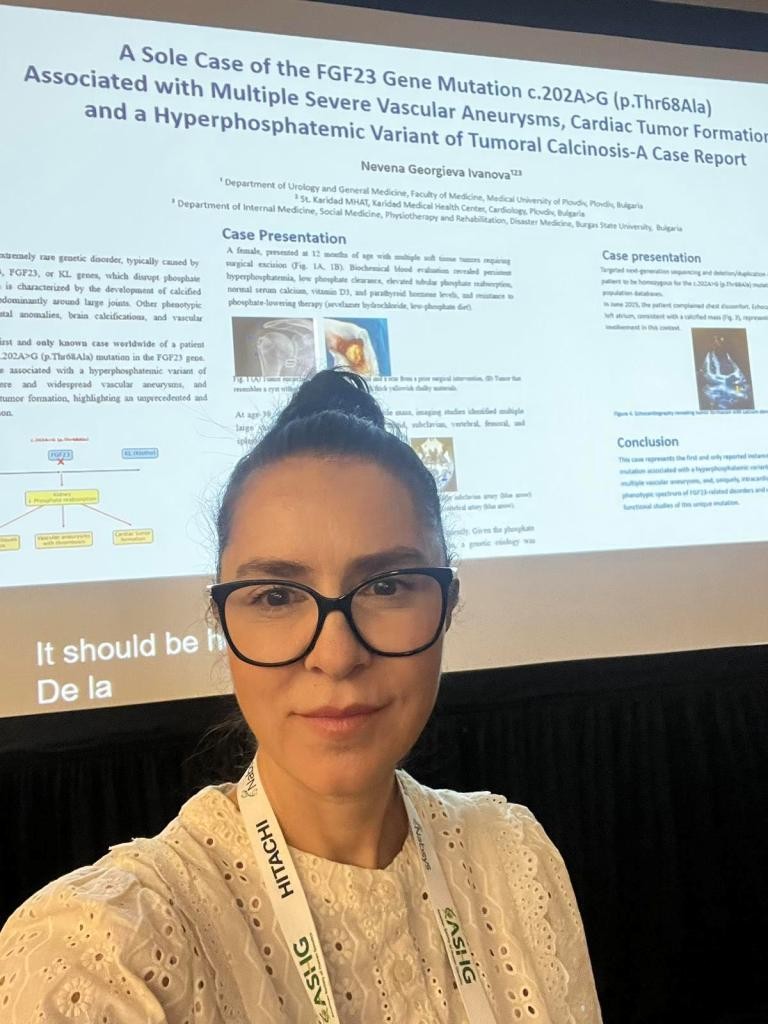 Доц. д-р Невена Иванова, д.м., бе единственият участник от България, включен в научната програма на форума по генетика – ASHG ‘2025 в Бостън, САЩ, който се проведе през октомври месец тази година. Нейното откритие е първо по рода си в световната наука и представлява значим принос към изследването на човешкия геном и генетичните механизми при редки заболявания. Случаят представлява първо описание на нова мутация в гена FGF23 (c.202A>G, p.Thr68Ala) при пациент с изключително рядко наследствено заболяване – хиперфосфатемичен вариант на туморна калциноза, усложнен с тежки съдови аневризми и тромбози.