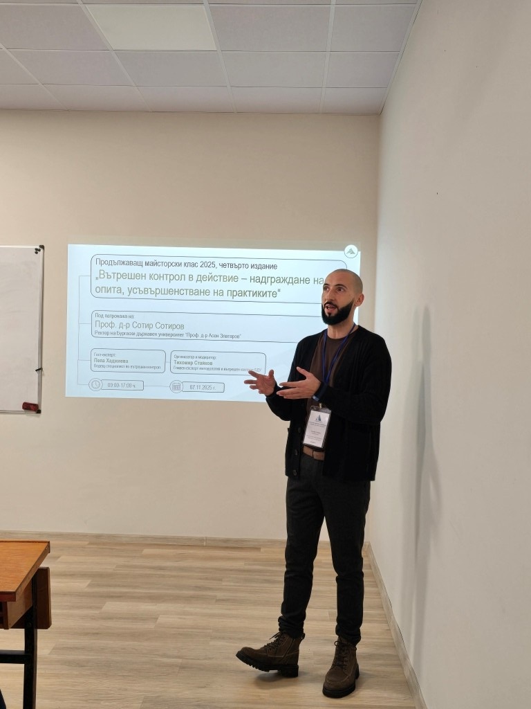 За четвърта поредна година Бургаският държавен университет „Проф. д-р Асен Златаров“ събра експерти от цялата страна за обучение по вътрешен контрол. Продължаващият майсторски клас под надслов „Вътрешен контрол в действие – надграждане на опита, усъвършенстване на практиките“ обедини специалисти от висшето образование, здравеопазването, държавната и местната власт. Инициативата се провежда ежегодно под ръководството на главния експерт по методология и вътрешен контрол Тихомир Стайков и с подкрепата на академичното ръководство на университета.