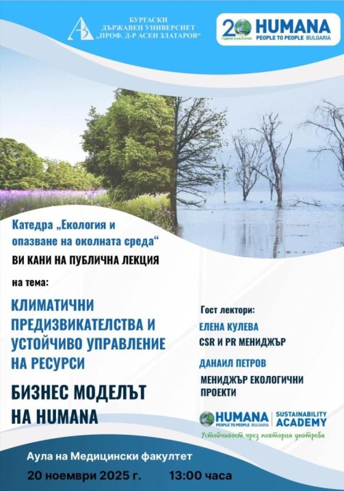 „Климатични предизвикателства и устойчиво управление на ресурси. Бизнес моделът на HUMANA“ e темата на публичната лекция, която представители на HUMANA People to People България ще изнесат пред студенти на Бургаския държавен университет „Проф. д-р Асен Златаров“. Това се случва по покана на катедра „Екология и опазване на околната среда“.