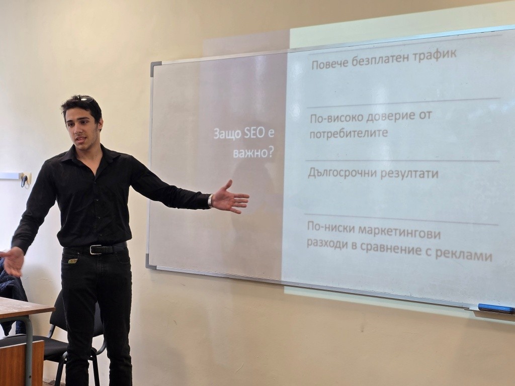 Лектори на срещата бяха гл. ас. д-р Христо Георгиев и Емил Караганев, които представиха ключови аспекти от света на SEO и AI технологиите. Студентите бяха запознати с основните принципи на SEO оптимизацията – начините, по които уебсайтовете могат да постигнат по-висока видимост в търсачките, да привлекат безплатен органичен трафик, да повишат доверието на потребителите и да изградят онлайн авторитет.