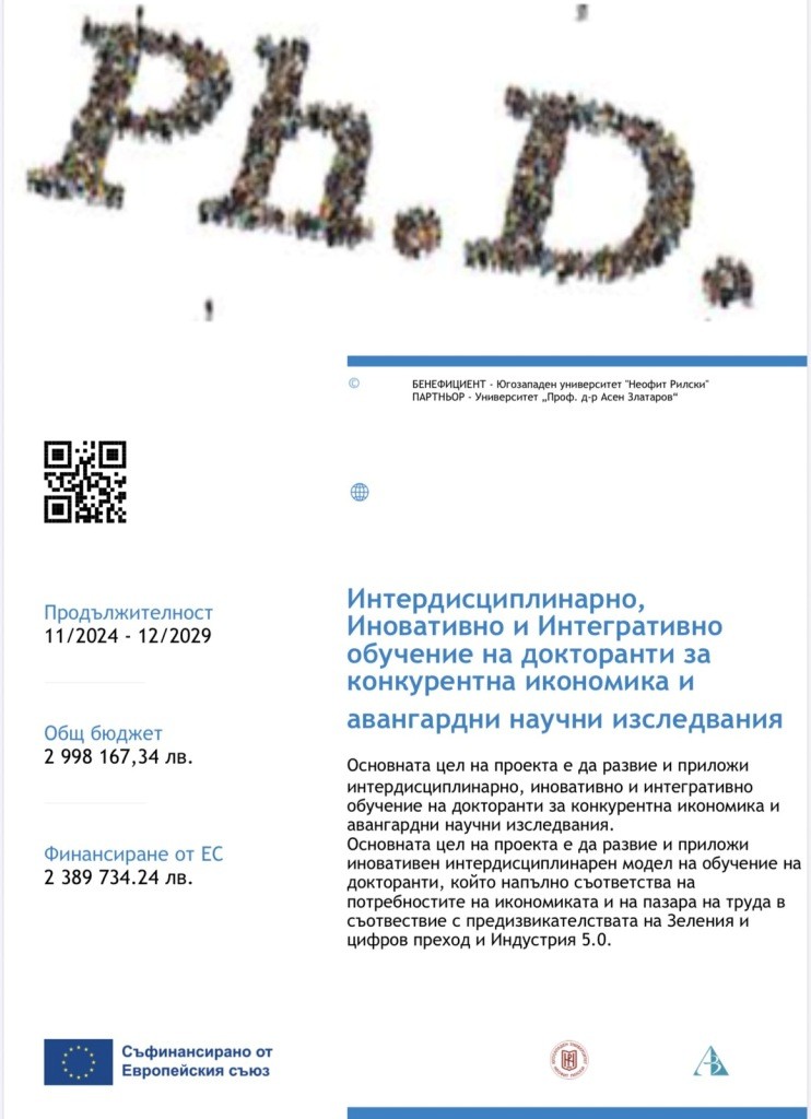 С изпълнението на дейностите ще се създадат и въведат иновативени и ориентирани към потребностите на икономиката, науката и висшето образование модели за обучение на докторанти. Концепцията е базирана на три взаимнодопълващи се подхода (3И): интердисциплинарно обучение - съчетаване на различни сфери на познанието чрез разработване и въвеждане на нови курсове и мултидисциплинарни подходи в докторантските училища по теми като зелена трансформация, син растеж и др.; иновативно обучение - ефективно използване на дигитализацията и новите технологии във всички сфери на научните изследвания и силен акцент върху съчетаване на практическия опит с трдиционните методи за обучение; интегративно обучение - консолидиране, съчетаване и координиране на общи и допълващи се елементи от програмите за обучение на докторанти. Проектът има за цел да развие този иновативен интердисциплинарен модел на обучение на докторанти, като същевременно го адаптира напълно към потребностите на икономиката и на пазара на труда в съотвествие с предизвикателствата на Зеления и цифров преход и Индустрия 5.0, основана на знанието. В рамките на предвидените дейности ще се реализират 24 проектни докторантури в 7 професионални направления, които са пряко обвързани с областите на ИСИС и нуждите на пазара на труда не само на регионално, но и на национално ниво. Ще се инвестира в развитието на докторантски училища в двата университета чрез създаването на нови интердисциплинарни курсове в области като зелена трансформация, дигитализация и син растеж, както и в нови курсове и електронно съдържание по съответните акредитирани докторантски програми. Предвидена е цялостна подкрепа за заложените проектни докторантури, включително и възможности за краткосрочна мобилност на докторантите. По проекта са включени и дейности за повишаване на капацитета на академичния състав.