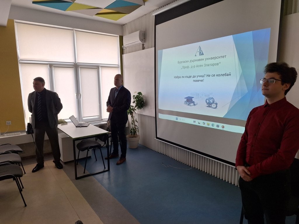 Представители на мобилната група от преподаватели и студенти към Бургаския държавен университет посетиха Професионалната гимназия по компютърно програмиране и иновации в Бургас, за да запознаят зрелостниците с възможностите за обучение, развитие и професионална реализация, които предлага университетът.