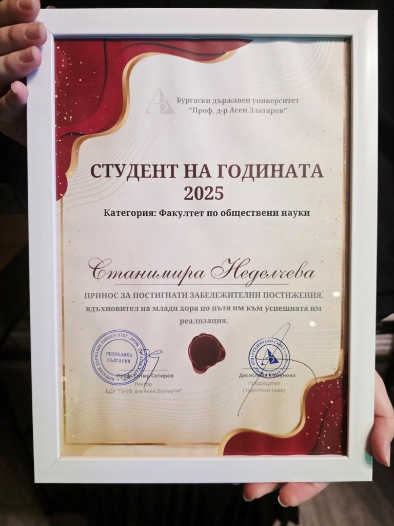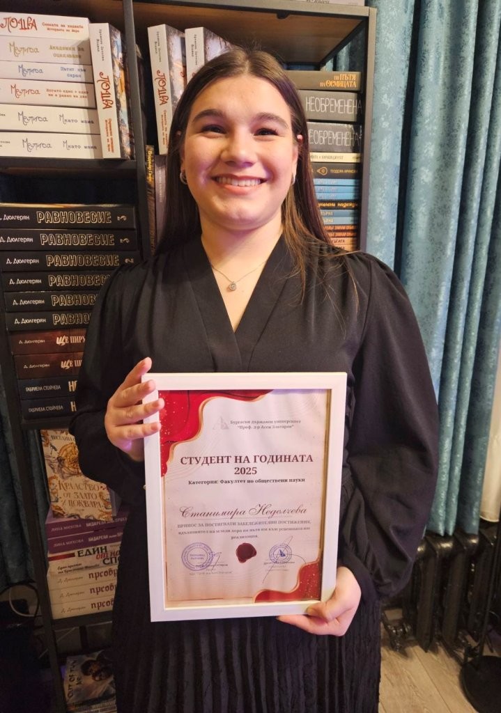 С гордост споделяме, че тазгодишната награда „Студент на годината“ на Факултет по обществени науки към Бургаски държавен университет “Проф. д-р Асен Златаров”“ е присъдена на Станимира Неделчева, студентка от специалност „Туризъм“, IV курс, редовна форма на обучение.